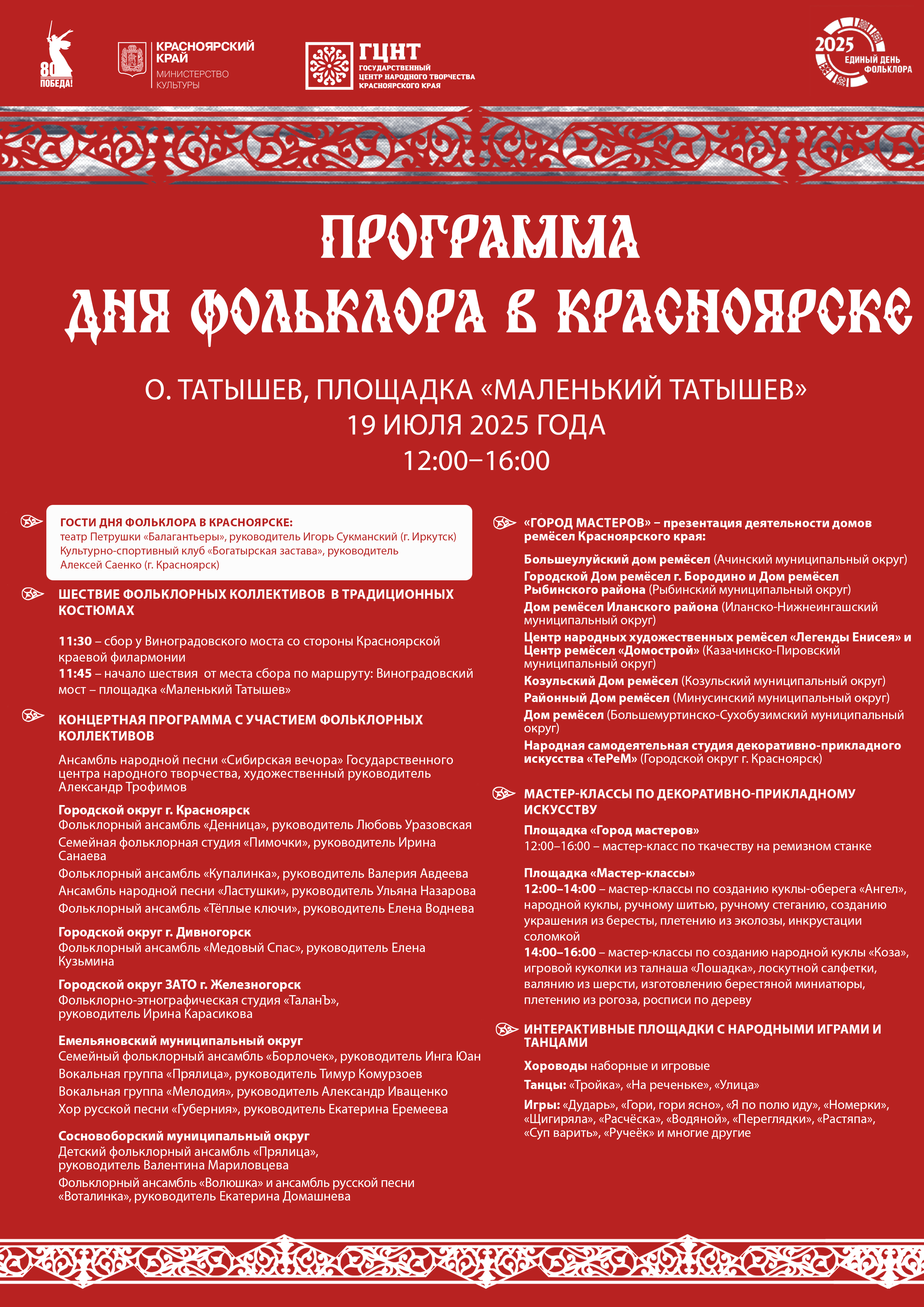 В этот день выступят лучшие фольклорные коллективы края. Ансамбль народной песни «Сибирская вечора» Государственного центра народного творчества презентует концертную программу «Сибирский календарь – Сибирская вечора».